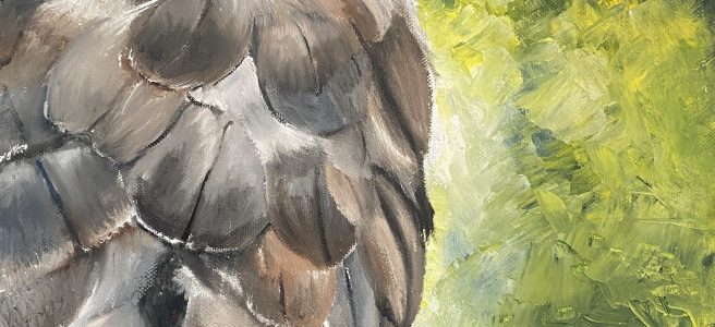 Here is a painting of a sparrow hawk that hangs around our backyard in the summer time. Every once in a while we will hear a screaming and see him carrying something in his talons to a near by limb. He is beautiful but vicious I cannot decide if I like him because he is beautiful or hate him because he preys on the innocent baby birds and chipmunks.
