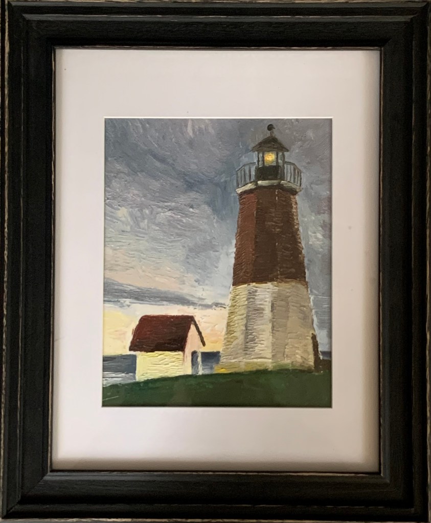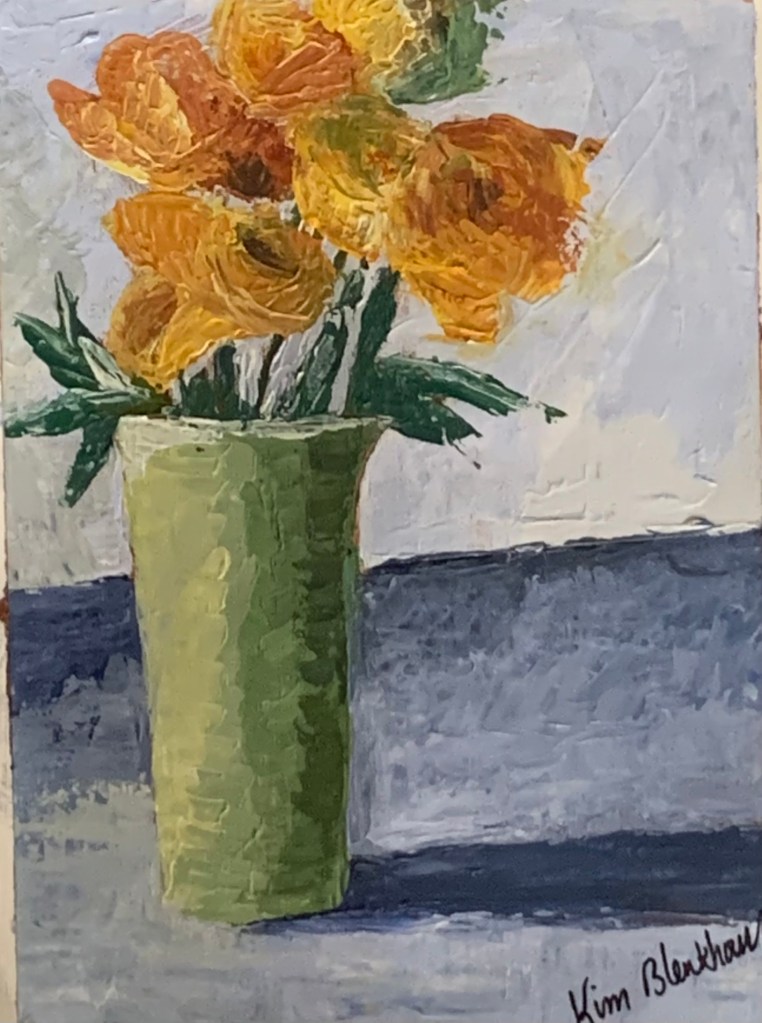 This was my first still life knife painting, from my first class at the Danforth Art Museum. Never use black. When adding shadows mix the correct color of the shadow. Also rarely use straight white for highlights. I used the side of the knife for the stem.