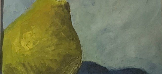 This was the second pear I painted with a knife and I think what works is the background color with the color of the pear. Both painted separately.