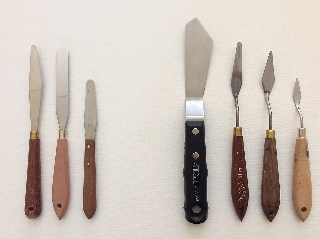 Utilize the edge of the knife, sometimes using sharp quick strokes or else slow and controlled. Always build your foundation first by blocking in colors and shapes and layering on details after. and remember to mix the colors on the palette then add the correct color to the canvas where you want it. Knife painting is more forgiving than you would imagine. A wrong color or application can be easily corrected by simply scraping the paint off.